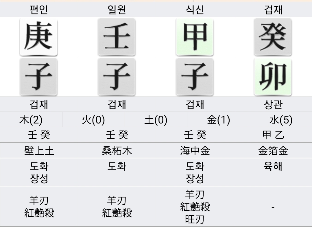 | 일간 | 갑(甲) | 병(丙) | 무(戊) | 경(庚) | 임(壬) |